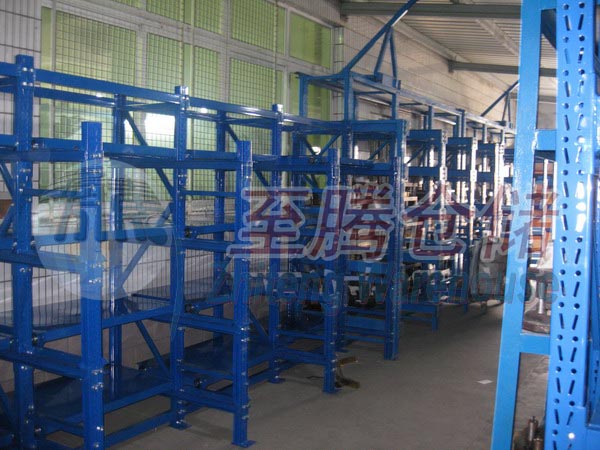 模具架又稱抽屜式貨架,模具擺放在模具架的每層抽屜層面上,通過軸承的作用,將模具抽出,再通過葫蘆或行吊等吊裝設備,將模具取出或存儲。