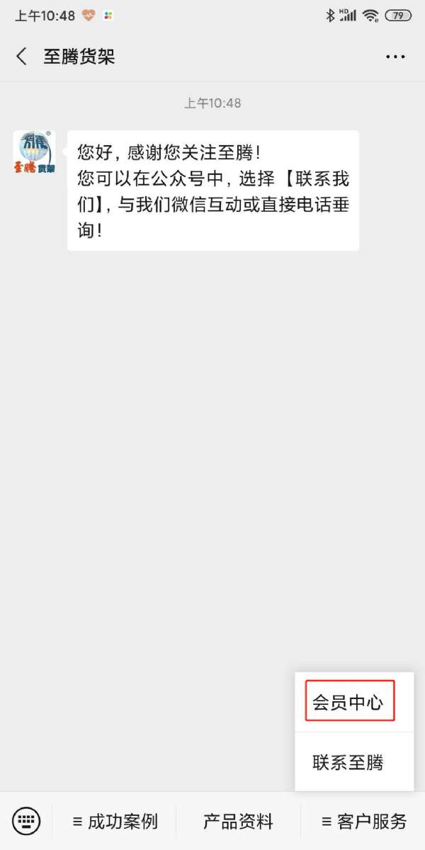 至騰客戶中心系統可以關注“至騰貨架”微信公眾號(查找公眾號或掃描上方二維碼),在公眾號下方“客戶服務”-“會員中心”進入。