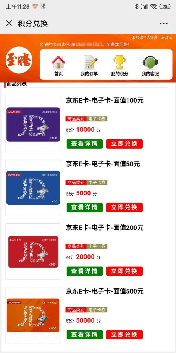 【我的積分】,顯示會員當前積分情況,以及進行積分兌換。