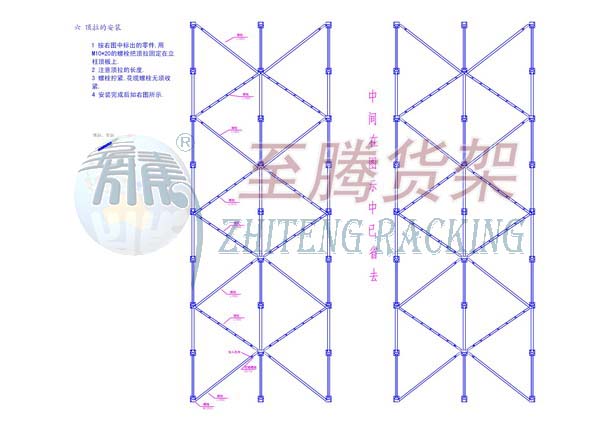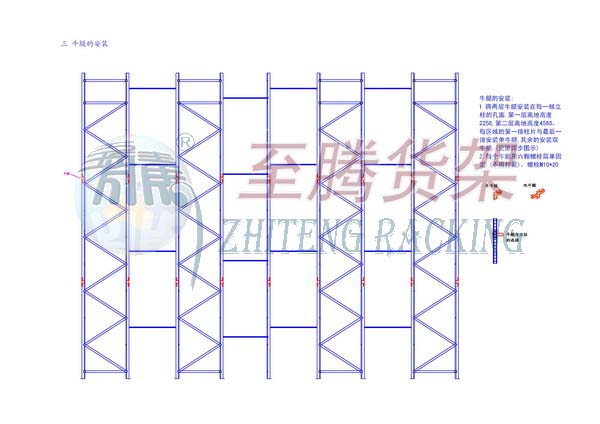 1 將兩層牛腿安裝在每一根立柱的孔面.第一層離地高度2258,第二層離地高度4568,每區域的第一排柱片與最后一排安裝單牛腿,其余的安裝雙牛腿.(見第四步圖示)